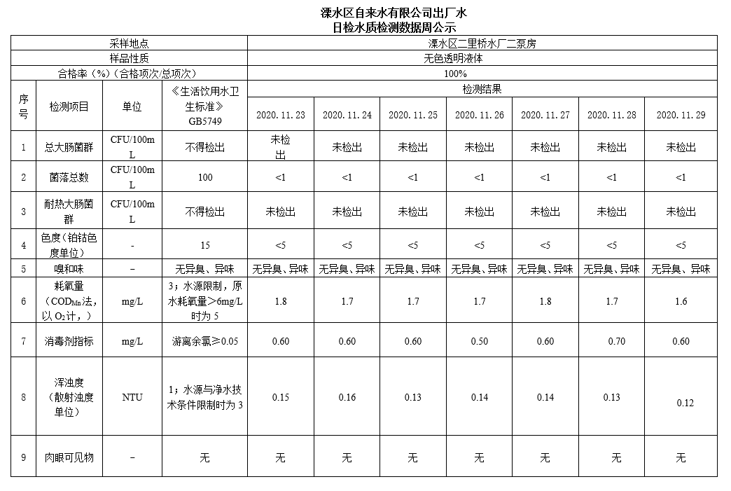 出廠水每周公示2020.12.1 時間:2020-12-01 分類:水質(zhì)公示 上一篇: 管網(wǎng)水(半月度公示2020.12.1) 下一篇: 出廠水每周公示(2020.12.8) 相關(guān)文章 出廠水每周公示2025.10.20-2025.10.26 2025.9.23管網(wǎng)水(月全) 2025.9.23出廠水、管網(wǎng)末梢水常規(guī)42項指標(biāo)(月度公示) 2025.9.4管網(wǎng)末梢、管網(wǎng)水(半月) 出廠水每周公示2025.10.13-2025.10.19 出廠水每周公示2025.10.6-2025.10.12 出廠水每周公示2025.9.29-2025.10.5 出廠水每周公示2025.9.22-2025.9.28