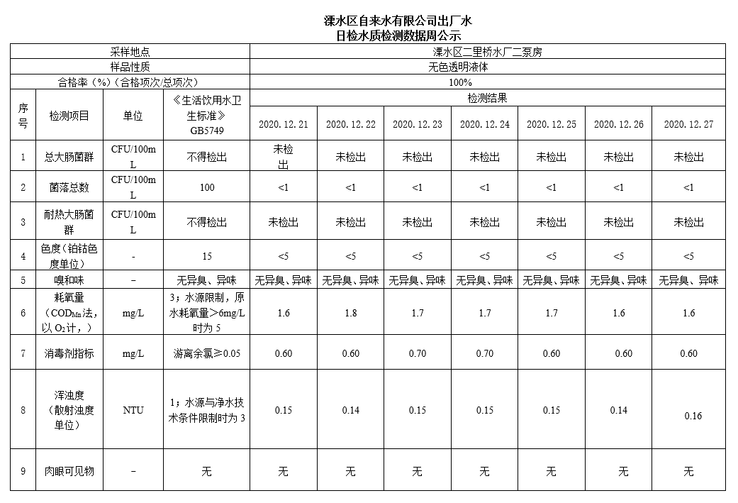 出廠水每周公示(2020.12.29) 時間:2020-12-29 分類:水質(zhì)公示 上一篇: 出廠水106項公示(半年度公示2020.12.28) 下一篇: 出廠水每周公示2021.01.05 相關(guān)文章 出廠水每周公示2025.10.20-2025.10.26 2025.9.23管網(wǎng)水(月全) 2025.9.23出廠水、管網(wǎng)末梢水常規(guī)42項指標(biāo)(月度公示) 2025.9.4管網(wǎng)末梢、管網(wǎng)水(半月) 出廠水每周公示2025.10.13-2025.10.19 出廠水每周公示2025.10.6-2025.10.12 出廠水每周公示2025.9.29-2025.10.5 出廠水每周公示2025.9.22-2025.9.28