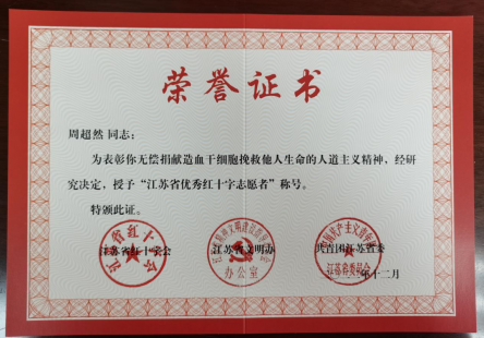 近日,省紅十字會、省文明辦、團省委聯(lián)合發(fā)文,表彰2021年12月以來成功實現(xiàn)造血干細胞捐獻的同志并授予“江蘇省優(yōu)秀紅十字志愿者”稱號。我集團職工周超然同志獲此殊榮。