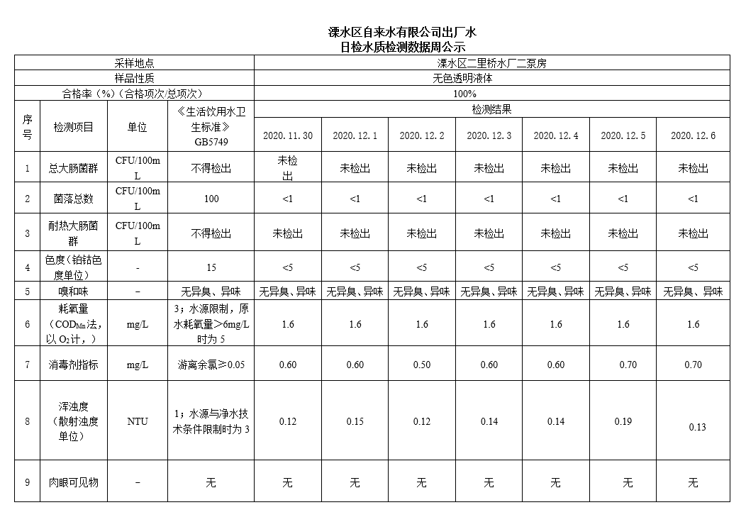 出廠(chǎng)水每周公示(2020.12.8) 時(shí)間:2020-12-08 分類(lèi):水質(zhì)公示 上一篇: 出廠(chǎng)水每周公示2020.12.1 下一篇: 出廠(chǎng)水每周公示2020.12.15 相關(guān)文章 出廠(chǎng)水每周公示2025.10.20-2025.10.26 2025.9.23管網(wǎng)水(月全) 2025.9.23出廠(chǎng)水、管網(wǎng)末梢水常規(guī)42項(xiàng)指標(biāo)(月度公示) 2025.9.4管網(wǎng)末梢、管網(wǎng)水(半月) 出廠(chǎng)水每周公示2025.10.13-2025.10.19 出廠(chǎng)水每周公示2025.10.6-2025.10.12 出廠(chǎng)水每周公示2025.9.29-2025.10.5 出廠(chǎng)水每周公示2025.9.22-2025.9.28